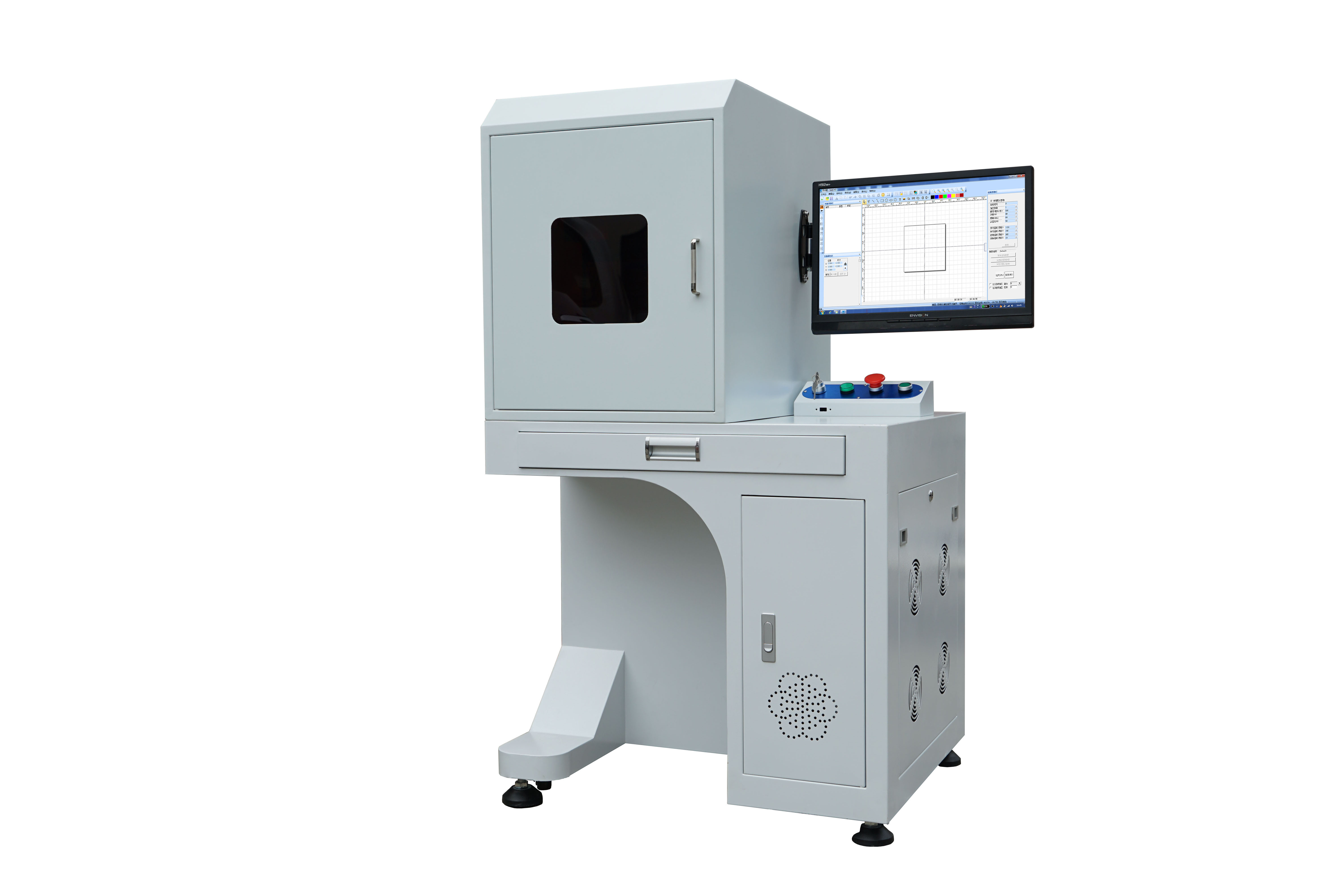 System Characteristic: Fiber laser has excellent beam quality and high precision marking ; The workbench is equipped with operating platform, which is widely used in factory, workshop etc; Totally enclosed design, small size, high speed marking, high repeat positioning accuracy; Without any daily maintenance for the laser, and working time is up to 100000 hours; No consumables, low power consumption less than 600W, greatly saving electricity bills.